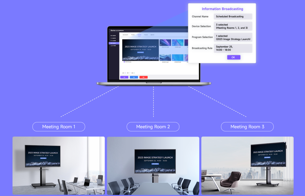 Unified Control Over All Meeting Rooms: The corporate meeting management software coordinates and manages each meeting room in real time.