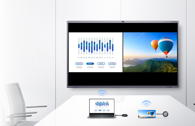 It supports rapid screen sharing from phones, tablets, and computers with one-click, facilitating discussions, presentation and file sharing. You can easily mirror images, videos, and documents from small screens to the large panel, catering to multiple viewers.